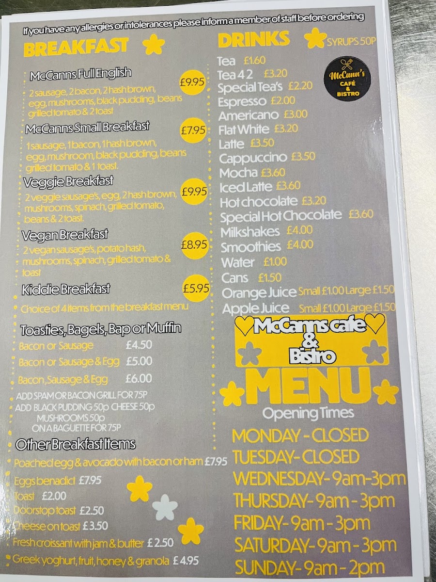 Welcome to McCanns Cafe and Bistro, a hidden gem located at 147 Wilmere Ln, Widnes. This delightful cafe offers a range of scrumptious menu options tailored for every palate. Start your day with a hearty McCanns Full English (£9.95) or indulge in a wholesome Veggie Breakfast (£8.95). For the little ones, the Kiddie Breakfast (£5.95) is a perfect choice.